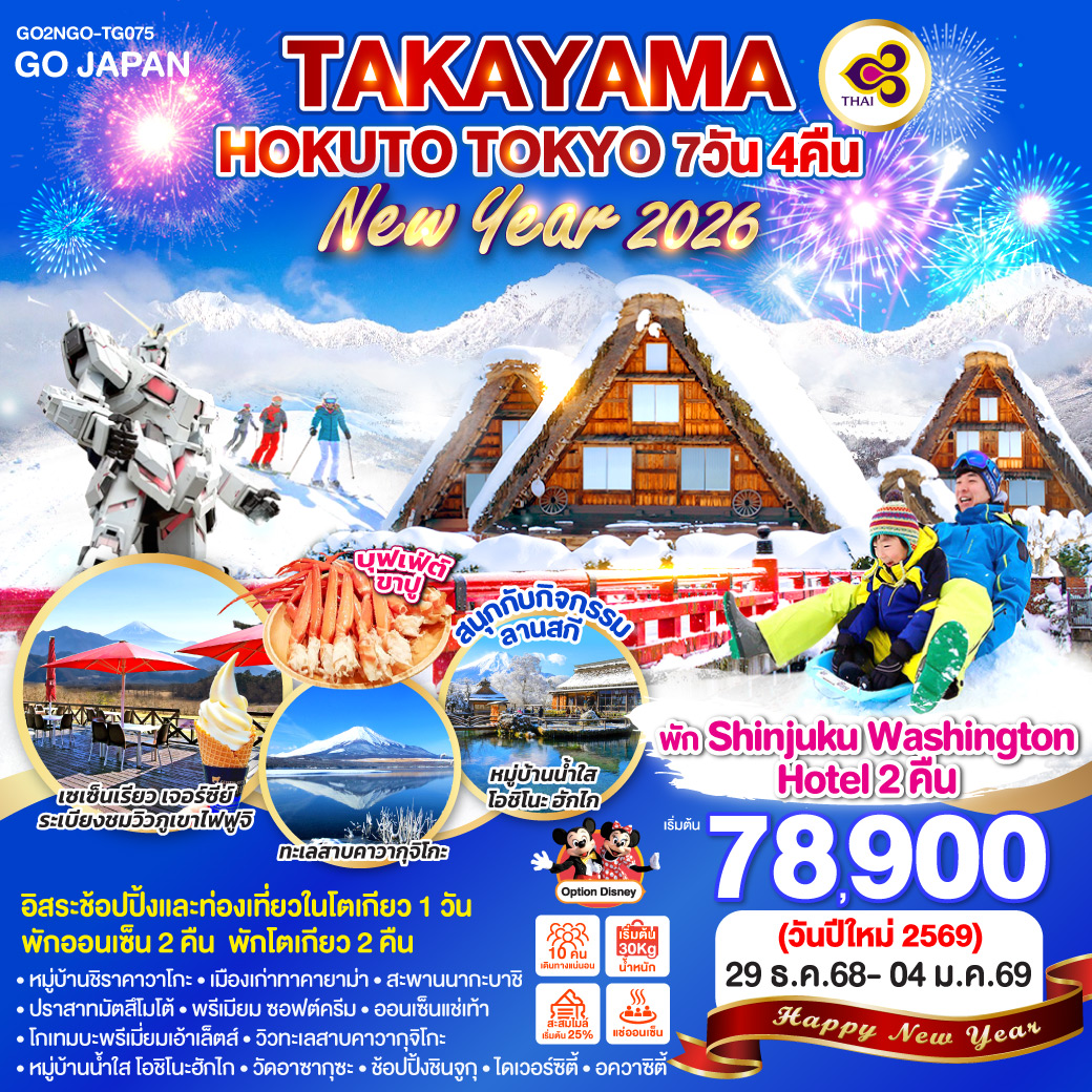 | 2 | นาโกย่า (สนามบินชูบุเซ็นแทร์) - หมู่บ้านชิราคาวาโกะ - เมืองทาคายาม่า – เมืองเก่าทาคายาม่า – สะพานนากะบาชิ - ผ่านชมทาคายาม่า จินยะ - แช่น้ำแร่ธรรมชาติ | ✘ | ✔ | ✔ | TAKAYAMA ONSEN HOTEL หรือเทียบเท่าระดับ 3 ดาว |