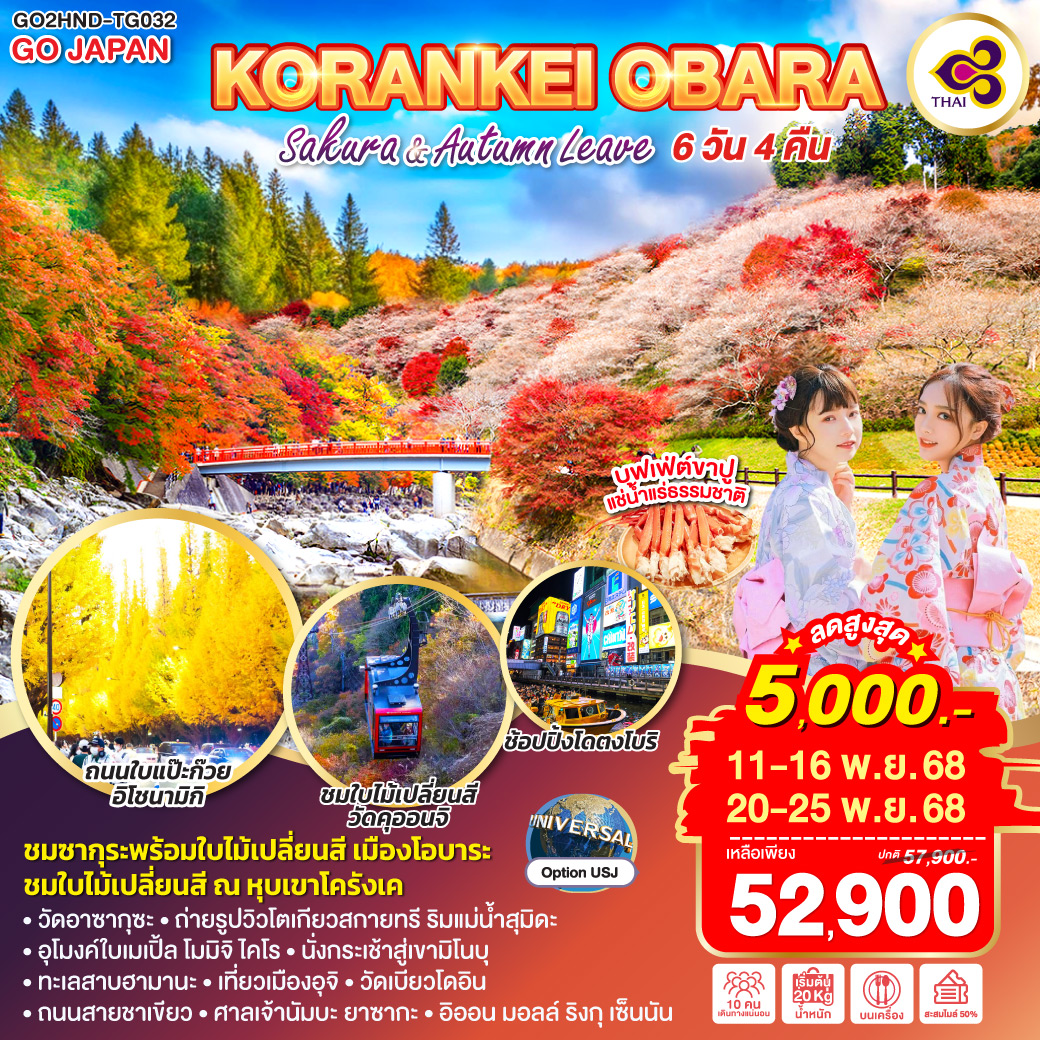 4 | ชมซากุระพร้อมใบไม้เปลี่ยนสี เมืองโอบาระ – ชมใบไม้เปลี่ยนสี ณ หุบเขาโครังเค –เมืองอุจิ – วัดเบียวโดอิน – ถนนสายชาเขียว – โอซาก้า | ✔ | ✔ | ✘ | OSAKA AREA HOTEL หรือเทียบเท่าในระดับ 3 ดาว |