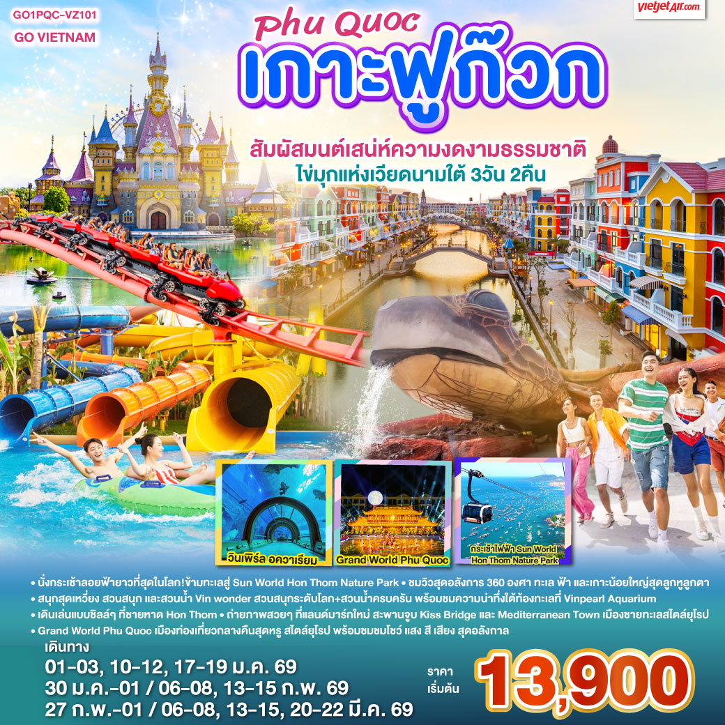 • กรุงเทพฯ (ท่าอากาศยานสุวรรณภูมิ) VZ980 | BKK-PQC | 10.05-11.25 • เกาะฟูก๊วก (ท่าอากาศยานนานาชาติฟูก๊วก) • นั่งกระเช้าสู่ Sun World Hon Thom Nature Park • Aquatopia Water Park • Exotica Village • ชายหาด Hon Thom • เมดิเตอเรเนียน ทาวน์ • สะพานจูบ • Duong Dong Night market |